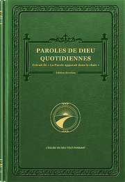 Ce livre présente une sélection de passages de La Parole apparaît dans la chair. Afin que les élus de Dieu puissent accéder à la vérité et au soutien quotidien de la vie par les paroles de Dieu Tout-Puissant, ont été ici spécialement sélectionnées pour la joie des gens Ses paroles essentielles qui sont très édifiantes pour l’entrée des gens dans la vie, permettant ainsi à ceux qui aiment la vérité de la comprendre, de vivre devant Dieu, d’être sauvés et rendus parfaits par Lui. Ces paroles essentielles de Dieu sont des expressions de la vérité ; en outre, elles sont les maximes de vie les plus essentielles, et il n’y a pas de paroles plus édifiantes et plus profitables pour les gens. Si tu es capable de vraiment apprécier chaque jour un passage de ces paroles, alors c’est ta plus grande richesse et tu es béni par Dieu. -