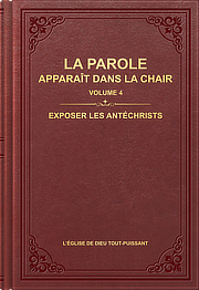 Exposer les antéchrists est le quatrième volume de La Parole apparaît dans la chair. Ce livre fait partie d’une série spécialisée de sermons et d’échanges donnés par Dieu Tout-Puissant, Christ des derniers jours, au sein des Églises. Dieu y expose en détail toutes les manifestations des tempéraments des antéchrists, les rendant parfaitement compréhensibles aux gens, et aidant ces derniers, de manière significative, à discerner la nature-essence des antéchrists. Les tempéraments des antéchrists sont des tempéraments sataniques communs à l’humanité corrompue. Pour être sauvé par Dieu, il faut accepter le jugement des paroles de Dieu avant de pouvoir être purifié. Ces vérités qui exposent les antéchrists font office d’avertissement, d’incitation, d’exposition et de jugement, et toutes ces choses sont extrêmement bénéfiques pour comprendre la vérité, se connaître soi-même et obtenir la purification. Ce n’est qu’en discernant les antéchrists que l’on peut éviter d’être induit en erreur par les autres, que l’on peut cesser d’idolâtrer et de suivre d’autres personnes, et que l’on peut, au contraire, atteindre le résultat qui consiste à suivre Dieu, à se soumettre à Lui et à L’adorer. -