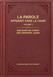 Discours de Christ des derniers jours est le troisième volume de La Parole apparaît dans la chair, exprimé par Dieu Tout-Puissant. La première partie du livre est composée de sermons et d’échanges prononcés en congrégation par Dieu Tout-Puissant, la deuxième partie contient des discours de Dieu Tout-Puissant avec les dirigeants et ouvriers, et la troisième partie comprend des échanges de Dieu Tout-Puissant avec une partie de Son peuple élu. Ces sermons et ces échanges traitent des problèmes existant dans l’Église, ainsi que des difficultés pratiques liées à l’entrée dans la vie des élus de Dieu. Ils soulignent non seulement l’essence des gens et leur situation actuelle, mais éclairent également les gens quant aux objectifs qu’ils devraient poursuivre. Ils sont extrêmement bénéfiques aux gens pour ce qui est de leur compréhension de la vérité et de leur réalisation de l’entrée dans la vie. -